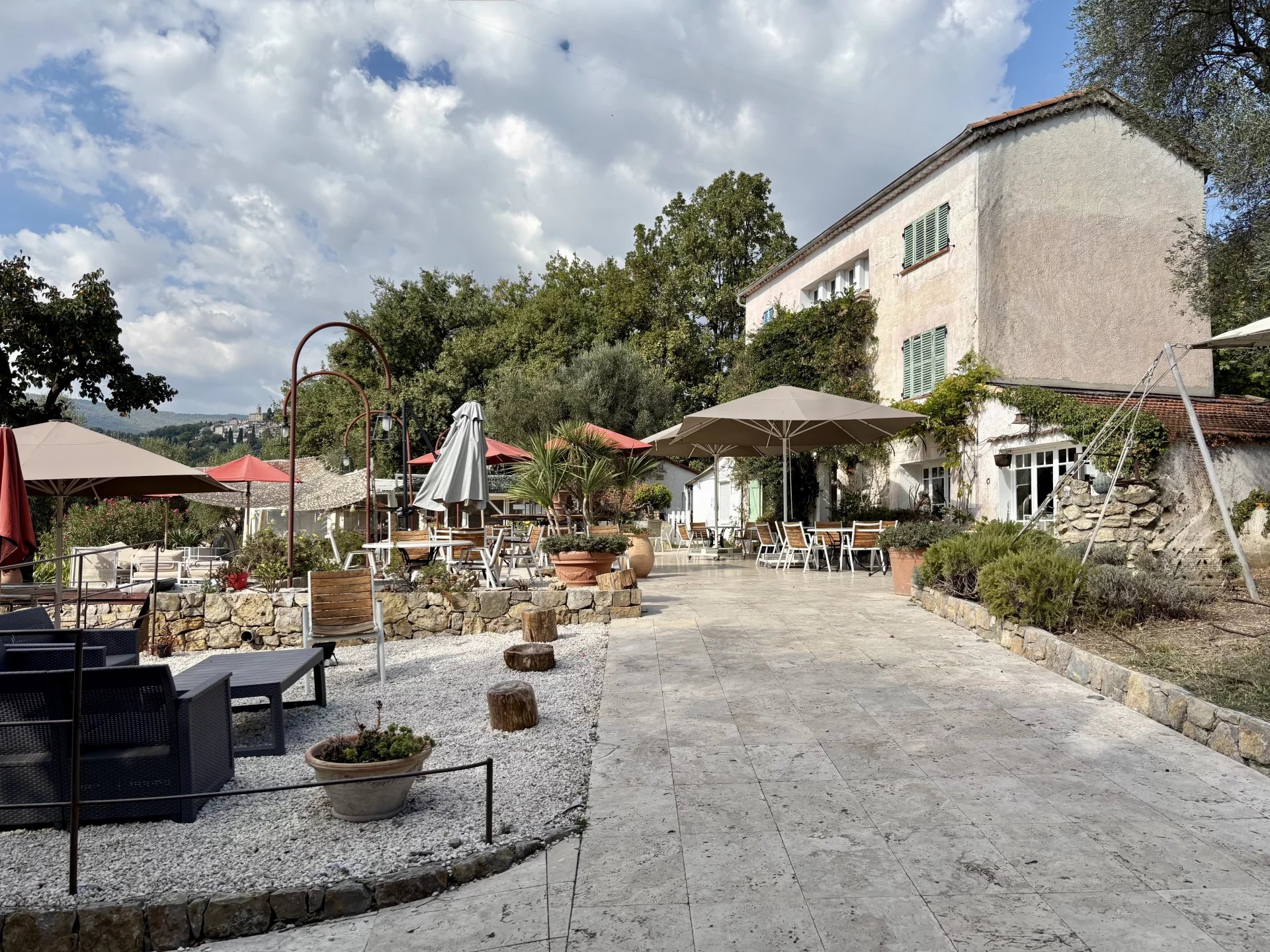 Le terrain entourant le mas, d’une superficie de 6000 m², arpente une grande terrasse en pierre de travertin, une seconde terrasse en bois et deux autres terrasses couvertes et climatisées pour accueillir des évènements.